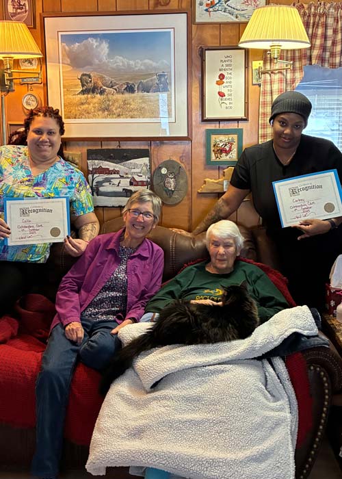 Cortney and Caitlin are two outstanding caregivers for FCP Live-In. Cortney has been with her current client since the middle of last year. She immediately took the lead in a two-caregiver case, organizing all the client’s needs and providing excellent hands-on care. Caitlin arrived a bit later as a fill-in caregiver. Caitlin’s skills and personality made it quickly apparent that she complemented the team, and the clients weren’t going let her go. Cortney and Caitlin continually work together, not only to meet their clients’ needs but to make their days enjoyable. They have brought one client to see the horses that she had to let go of when she was no longer able to care for them. On a client’s birthday, Cortney and Caitlin decorated her space and made cards from her cats signed with a paw print. Both Cortney and Caitlin are wonderful individually, but together they are an AMAZING team. Thank you, Cortney and Caitlin, for being valuable members of the FCP Live-In Team!