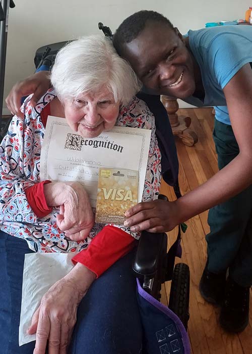 Lucritha is a wonderful caregiver and has shown her expertise in working with individuals recovering from strokes. Lucritha is so patient and loves to motivate her clients and keep their spirits high, even when they are going through the most challenging times in their lives. Lucritha’s most recent client is recovering from a stroke that impacted her left side and her speech. Lucritha has built such a close relationship with this client and is her biggest cheerleader. Her client was so happy when Lucritha was presented with this award, she wanted to be in the picture with her to show her appreciation. Thank you, Lucritha, for being a member of the FCP Live-In Team!