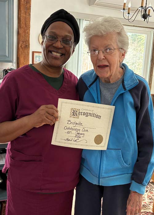 Valerie has been a caregiver for Terry [client], from Sidney, Maine since February. Valerie has worked hard to keep Terry in the moment as she faces Alzheimer’s and the confusion that sometimes goes along with the disease. Valerie is well-liked by the family and they feel Terry is in safe hands. Valerie is a wonderful caregiver and is calm, quiet, loving and spiritual, and able to handle any situation she may face. Thank you, Valerie, for being a member of the FCP Live-In Team!